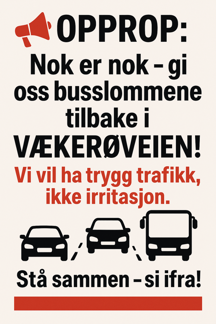 Vi vil ha trygg trafikk. Vi vil ha bedre flyt. Vi vil ha busslommene tilbake i Vækerøveien!